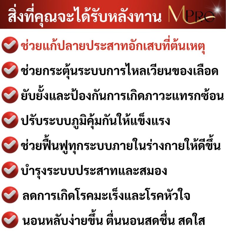 แต่พี่โชคดีที่เพื่อนของลูกชายแนะนำให้ทานสมุนไพรสกัดจากธรรมชาติที่ชื่อ MPro เพราะคุณแม่เขาก็มีอาการเหมือนพี่ แถมหนักกว่าพี่อีก ตอนเป็นถึงขั้นหัวใจเต้นผิดจังหวะ และต้องไปกายภาพบำบัดด้วยเครื่องสัปดาห์ละ 2-3 ครั้ง รักษากับหมอดังๆมาเยอะมาก แต่ก็ไม่หาย เขายังทานแล้วหายเป็นปกติ พี่เลยสั่งชุดโปร 2 แถม 1 มาลองทาน